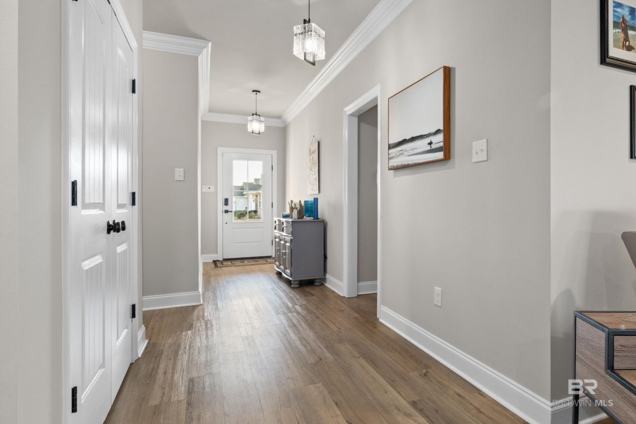 Paradise Found! Beautiful split-plan 4BR/2BA open-concept home approximately 3 years old that shows like new! This thoughtfully designed home features luxury vinyl plank flooring throughout, crown molding, recessed lighting, blinds, undermount sinks, maple cabinetry, Venetian bronze plumbing fixtures, and a corner electric fireplace with granite profile. The kitchen is both stylish and functional, offering stainless appliances, quartz countertops, and a large island creating a warm and inviting space perfect for everyday living or entertaining. The spacious primary suite includes a double vanity, garden tub with shower, and two walk-in closets. Three additional generously sized bedrooms provide flexibility for family, guests, or a home office. Additional highlights include a covered front porch, architectural 30-year shingles, professional landscaping, smoke and carbon monoxide detectors, and vinyl Low-E MI windows. Gold Fortified Certified for enhanced durability and potential insurance savings. Step outside and unwind in your private backyard retreat. Relax under the covered rear porch or enjoy the 14 x 26 saltwater pool installed May 2023 - ideal for entertaining or peaceful evenings at home. The location of this home could not be more convenient. Gorgeous white beaches are just 20 minutes away, shopping, dining, theme park, entertainment and more are within a very short commute. Move-in ready and better than new, don't miss this one! Items reserved: Refrigerator, flagpole, Washer & Dryer, TV's and mounts, alarm system, Tesla charger. Storage building is reserved by the seller, but negotiable. Surround sound speakers to remain. Buyer to verify all information during due diligence.